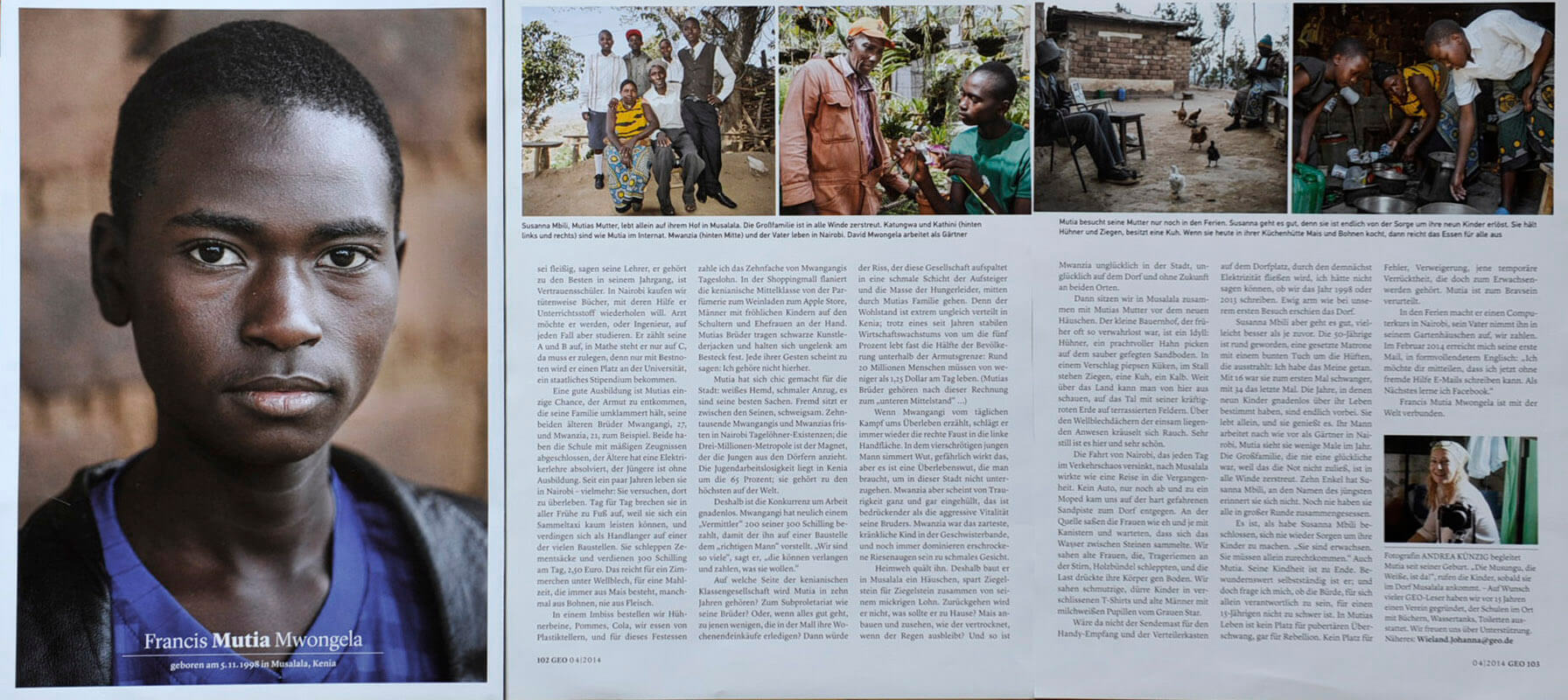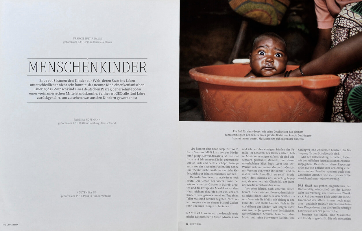 I have been working in Kenya for the last 20 years on the long-term photographic GEO project, Basic Needs: "Menschenkinder" - how a child lives in Africa and, in the meantime, young adults in Kenya (1998-2019). Several photographers worked on three continents, Germany, Vietnam and Kenya, to tell the story of humankind's children.